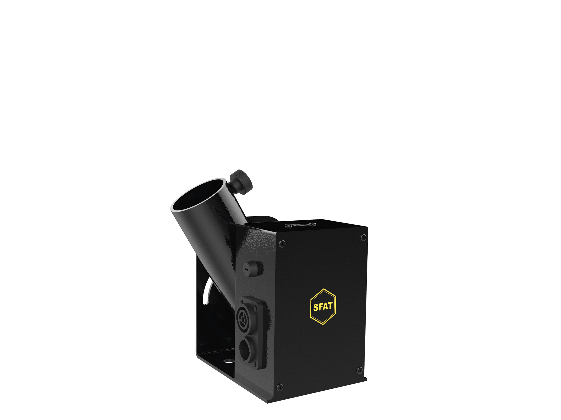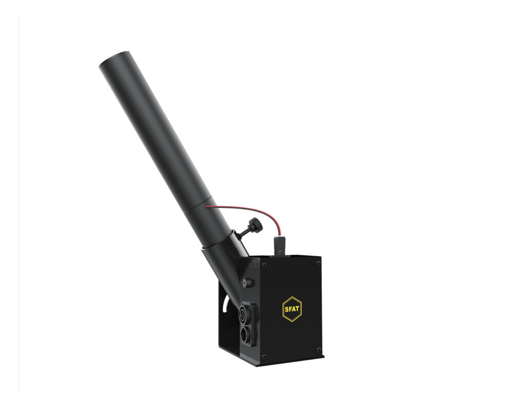 Its design allows easy installation, either on a structure (with safety hook) or on a decoration fixed by its base, on the ground or on a stage in a safe area to avoid shooting too close to the public.